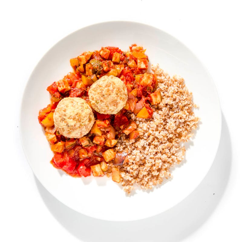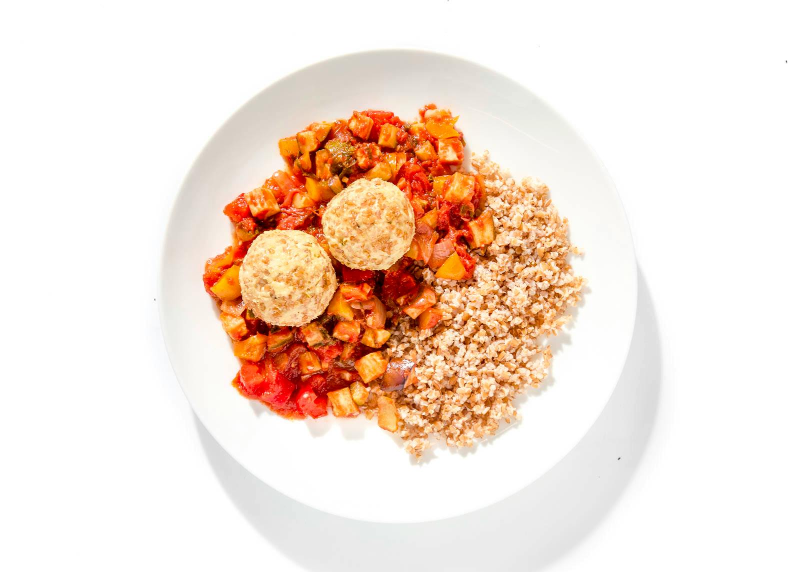 Protein-packed turkey meatballs rest on a bed of slow-cooked ratatouille made with eggplant, zucchini, and bell peppers simmered with tomatoes and herbs. Nutty bulgur adds fiber and texture to this balanced meal designed for energy and flavor.
