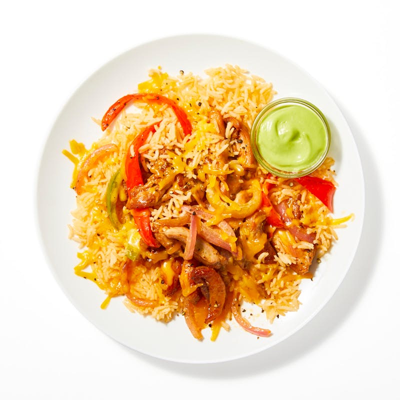 Cream Cheese, Chicken Thigh, Canola and Olive Oil Blend, Yellow Bell Pepper, Cholula Sauce, Red Onion, Plum Tomato, Onion Powder, Garlic Powder, Black Pepper, Mild Cheddar Cheese, Chili Powder, Garlic, Sour Cream, Onion, Basmati Rice, White Pepper, Kosher Salt, Chicken Base, Lime Juice, Green Bell Pepper, Avocado, Red Bell Pepper, Cayenne Powder, Citric Acid, Paprika