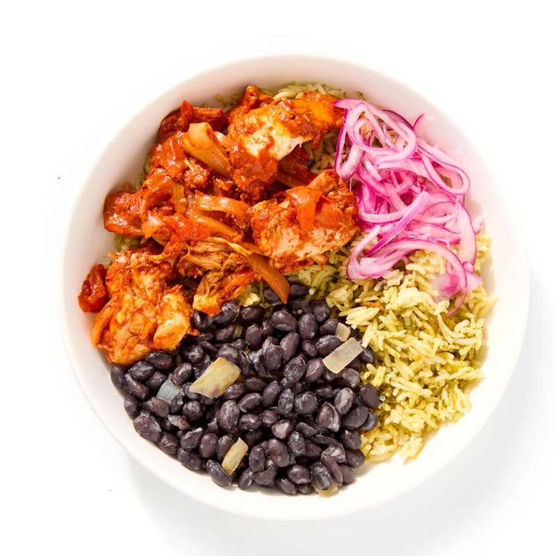 The flavors of Yucatán—where citrus, smoke, and spice reign supreme—in a colorful one-bowl-wonder. Chef Andres coats chicken thighs in a bright marinade of achiote seeds, garlic, and bittersweet orange juice (a signature in this type of cuisine), before they’re simmered low and slow alongside onions and tomatoes. It’s all piled over herby green rice, hearty black beans, and tangy pickled red onions.