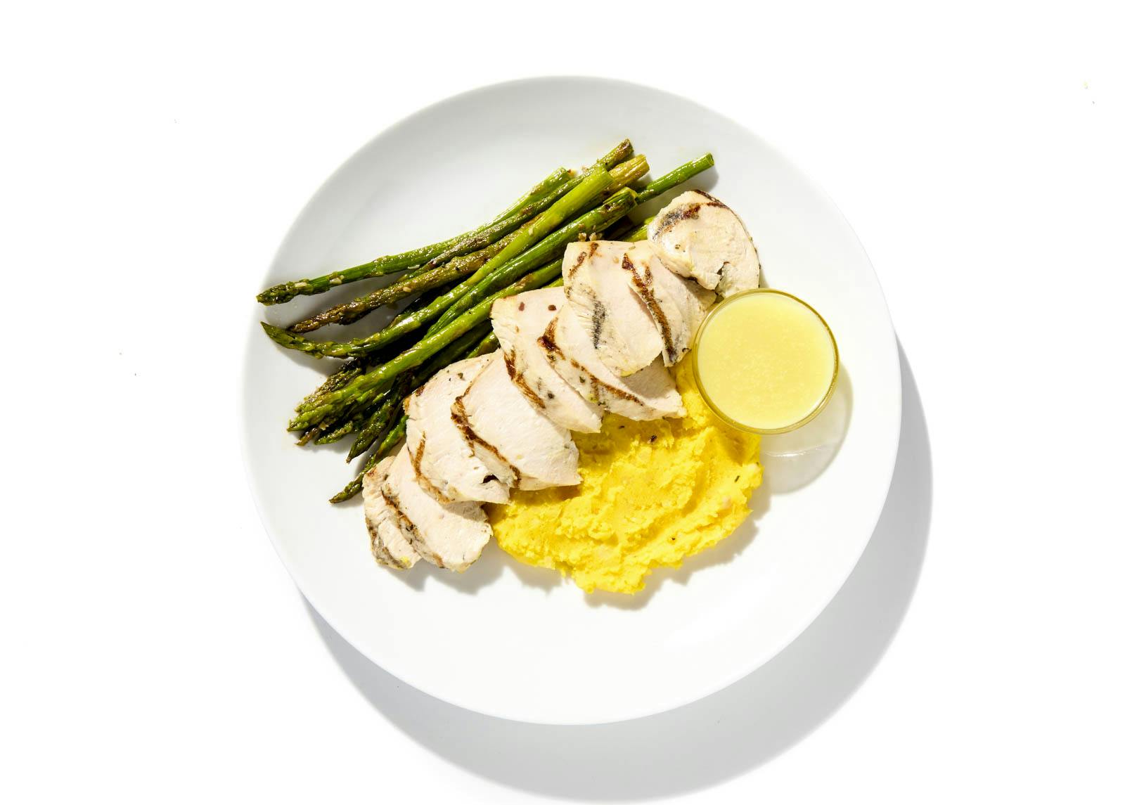 Say hello to your new favorite weeknight dinner. Tender chicken breast is marinated with an aromatic blend of shallots and rosemary and cooked to juicy, never dry, perfection. The chicken is served atop a bed of Parmesan-laced mashed potatoes that boast a rich and velvety texture and bright yellow hue thanks to a hint of turmeric. Accompanied by perfectly grilled asparagus, this dish highlights a harmonious blend of savory and comforting flavors that will leave you craving more with each bite.