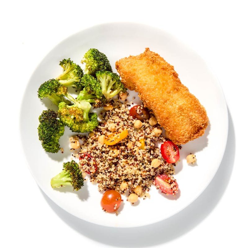 Canola and Olive Oil Blend, All Purpose Flour, Extra Virgin Olive Oil, Cherry Tomato, Broccoli , Black Pepper, Garlic, Honey, Dijon Mustard, Egg, Kosher Salt, Canned Chickpeas, Tri-color Quinoa, Lemon Juice, Crushed Red Pepper, Panko Breadcrumbs, Salmon, Whole Milk, Parmesan Cheese