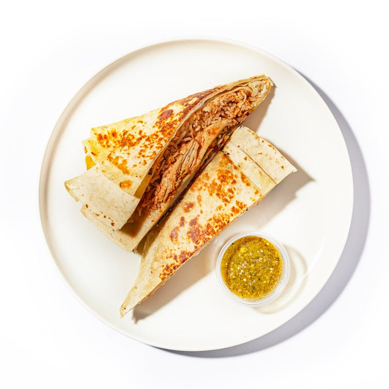 Satisfy your quesadilla craving with some smoky, zesty, cheesy goodness from Chef Dustin. Bite into the perfectly toasted folded tortilla to find a tasty blend of tender chipotle-marinated chicken, cilantro-lime rice, creamy cheese, black beans, and corn. Top it all off with salsa verde for a refreshing finishing touch.