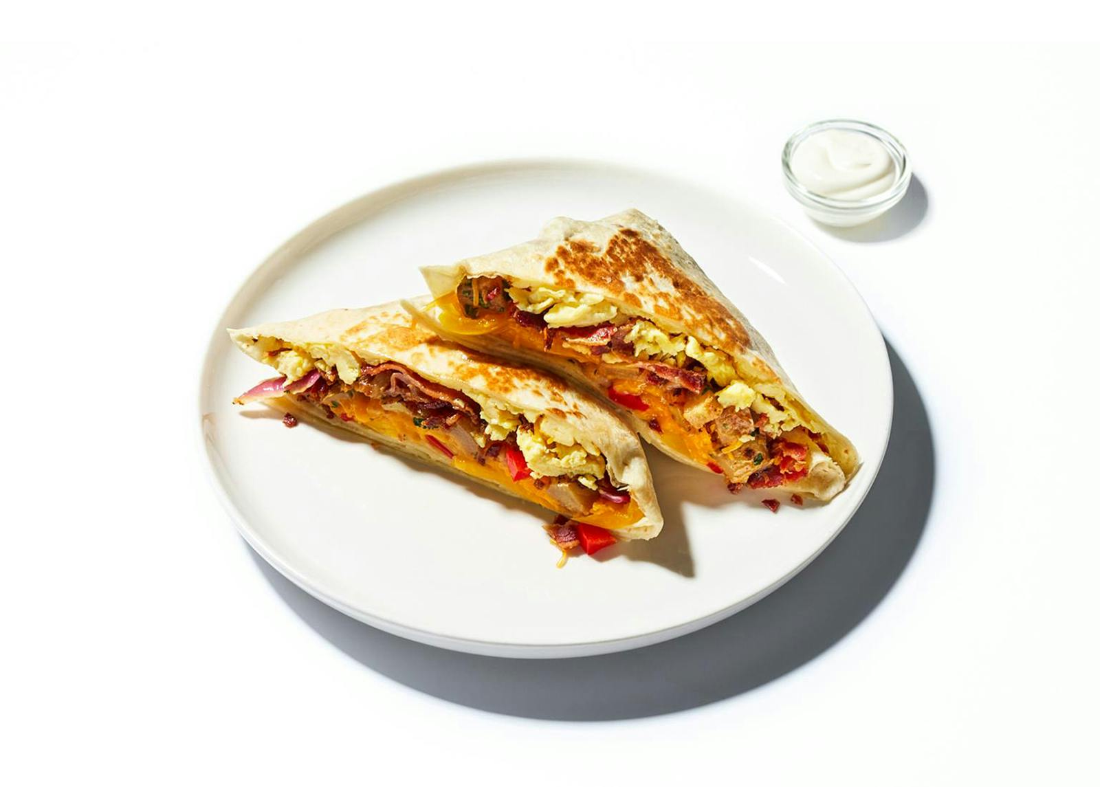 Canola Oil, Salt, Garlic, Spice, Parsley, Dried, Bacon, Flour Tortilla, Yellow Bell Pepper, Red Onion, Garlic Powder, Mild Cheddar Cheese, Egg, Potato, Kosher Salt, Grapeseed Oil, Red Bell Pepper, Whole Milk