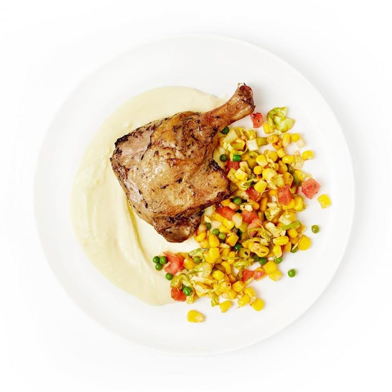 Chef Dustin's duck leg confit is prepared with the traditional French technique, and the resulting meat is so tender it's practically falling off the bone. To give a contrast of texture Chef pairs it with a bright succotash salad full of roasted corn, peas, Brussels sprouts, tomato, and spices, as well as a Yukon gold potato purée to bring a creamy, rich element. A side of red pepper compound butter can be added atop any component of the dish to instantly elevate its flavor.