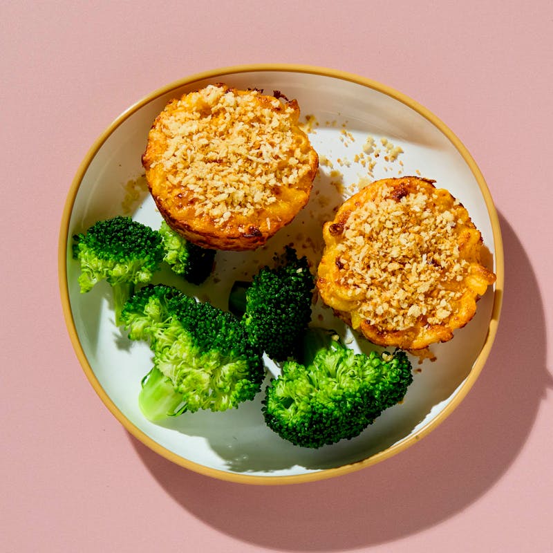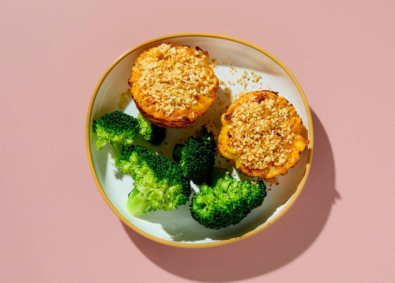 Classic mac and cheese gets the kid-friendly upgrade: baked into a crispy-edged cup with a golden panko topping. On the side, steamed broccoli tossed in butter for a simple, reliable veggie win.