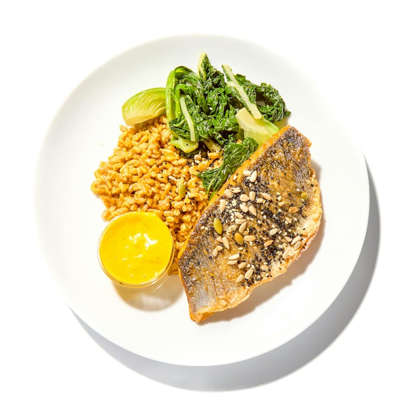 Mango Puree, Canola and Olive Oil Blend, Turmeric, Nigella Seeds, Extra Virgin Olive Oil, Pumpkin Seeds, Black Pepper, Cumin, Swiss Chard, Garlic, Sugar, Farro, Kosher Salt, Amba Powder, Lemon Juice, Sunflower Seeds, Canola Oil, Bok Choy, Branzino, Sesame Seeds, Paprika
