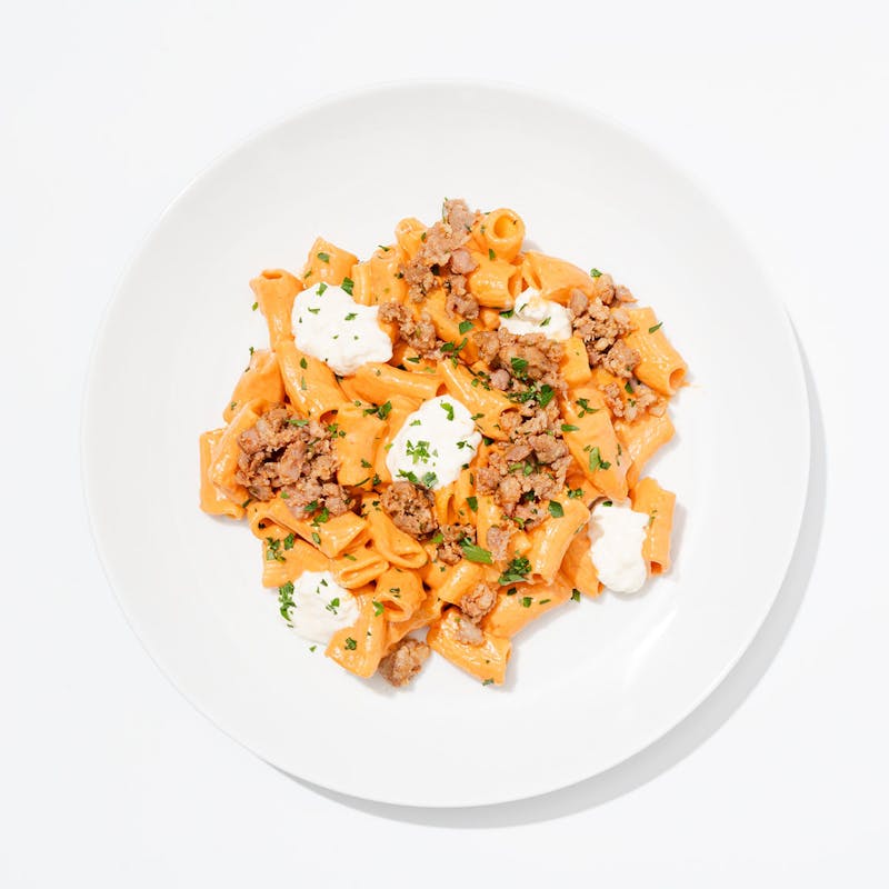 Spicy Italian pork sausage is folded through al dente rigatoni and slicked in a glossy, velvety vodka sauce of tomato paste, Calabrian chili, Parmesan, and cream. The alcohol keeps things emulsified and the flavour turned up to eleven. A final flourish of mozzarella melts on top, bringing a cool, creamy contrast to every saucy bite.