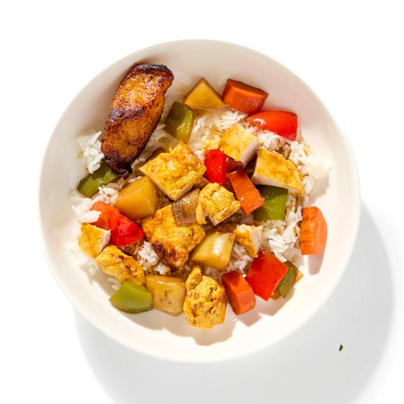 This Jamaican-style curry features bone-in chicken simmered with root vegetables, thyme, and scotch bonnet in a rich, golden sauce. The dish is completed with citrusy jasmine rice and sweet fried plantains.