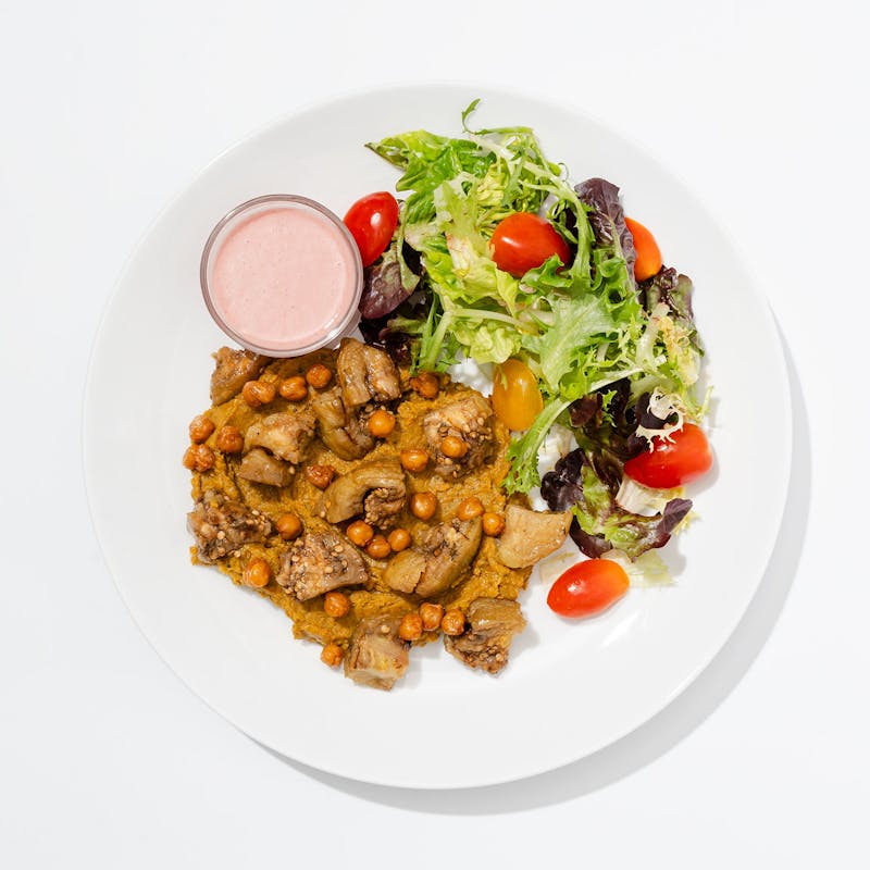 *NOTE: Nutritional Values are calculated assuming full consumption of all included condiments or dressings, which may make up a significant percentage of the values below. Chickpeas don’t always get to be the main event—but here, they shine. Chef Dadrian simmers them in coconut milk with green onion, garlic, and aromatic spices, then blends them into a velvety curry purée. Smoky grilled eggplant is piled on top, with a tomato-studded salad providing a refreshing contrast. A drizzle of pomegranate dressing brings a colourful, tangy finish.