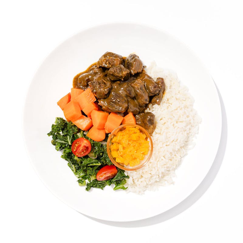This Caribbean-inspired dish features tender, bone-in goat slow-simmered in a rich curry with garlic, ginger, scotch bonnet, thyme, and warming spices. It’s served with lemon-scented jasmine rice, steamed carrots, and sautéed kale and collard greens, finished with sweet cherry tomatoes. A bright, tangy-sweet papaya chutney with mango juice and cider vinegar brings the perfect contrast to the savory depth of the curry.