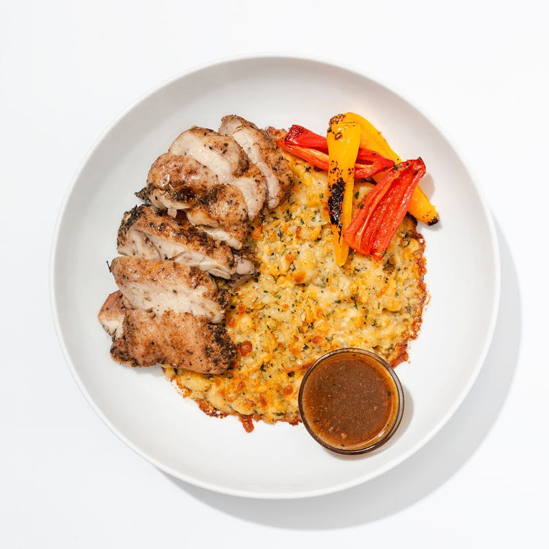 *NOTE: Nutritional Values are calculated assuming full consumption of all included condiments or dressings, which may make up a significant percentage of the values below. Chef Dadrian first learned this dish from his mentor—but it’s the playful Jamaican flavours he added that make it his own. Chicken thighs are marinated overnight in a fragrant rub of thyme, paprika, garlic, and allspice, then grilled and roasted until tender and smoky. On the side, baked mac and cheese gets the royal treatment, with four different cheeses (cheddar, mozzarella, pepper jack, and Swiss), grilled corn, and a hit of habanero. A breadcrumb crust and sweet baby peppers bring it all home.