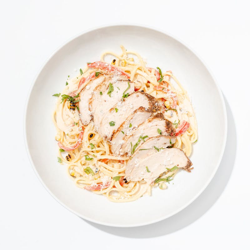 *NOTE: Nutritional Values are calculated assuming full consumption of all included condiments or dressings, which may make up a significant percentage of the values below. When Alfredo goes island mode, this is what happens. Al dente linguine gets tossed in a silky coconut sauce enriched with garlic, parmesan, and a splash of cream. It's all topped with smoky, spice-rubbed chicken breast, along with grilled corn and red bell peppers for sweetness and char. A drizzle of jerk sauce—packed with tropical herbs and spices—brings a final layer of sun-soaked heat.