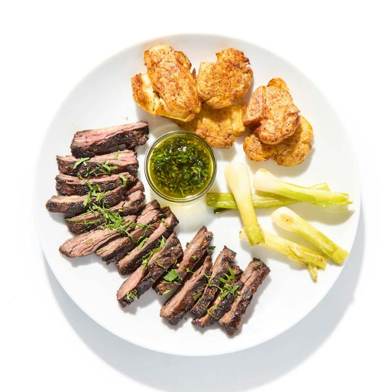 Give your regular steak-and-potatoes combination a premium upgrade, Argentina-style. Chef Jose Garces serves a hearty portion of his perfectly seasoned, medium-rare grilled grass-fed skirt steak with papas a la chapa (aka smashed potatoes) and charred green onions. Pour on the accompanying chimichurri sauce to add even more Argentinian flair. For a twist on tradition, Chef Jose adds sweet basil in addition to oregano and parsley to his version of the South American staple condiment. Pour it on and dig in!