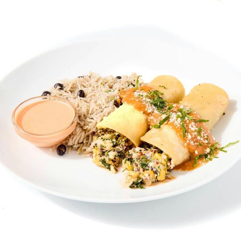 Chef Jose has been serving enchiladas for nearly 20 years—but this meatless version stands out. Instead of a traditional filling, he layers tender quinoa and kale with Oaxaca and Monterey Jack cheese, then wraps it all up in tortillas and tops them with a smoky chipotle cream. Black beans and rice round out the plate, adding comfort and heft.