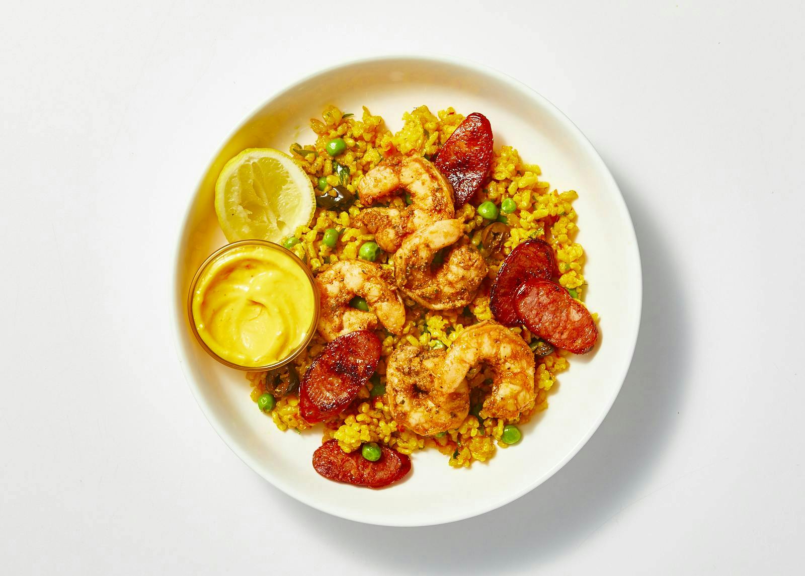Canola and Olive Oil Blend, Turmeric, Brown Sugar, Chorizo, Allspice, Calasparra Rice, Vegetable Base, Shrimp, Black Pepper, Cumin, Cooking Spray, Cilantro, Lemon, Garlic, Kalamata Olives, Cinnamon, Sweet Paprika, Sugar, Onion, Peas, Kosher Salt, Clove, Monosodium Glutamate, Saffron, Espelette Pepper , Mayonnaise, Chicken Base, Chipotle in Adobo, Lemon Juice, Red Bell Pepper, Ancho Powder, Cayenne Powder, Canned Piquillo Peppers, Italian Parsley