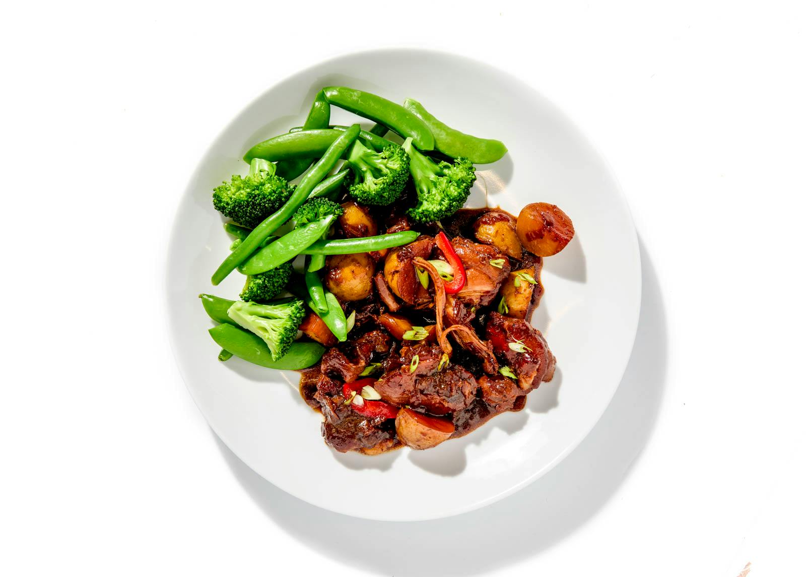 "Growing up, I partially raised and looked after by a Filipino caregiver who had me falling in love with Filipino cuisine from the time I could walk," says Chef Toben. Here, Chef whips up a classic Filipino adobo made with tender braised chicken thighs simmered with soy sauce, vinegar, garlic, and bay leaf. Yukon potatoes soak up the savory, tangy sauce, while a medley of steamed green beans, broccoli, and snap peas keeps the plate fresh.