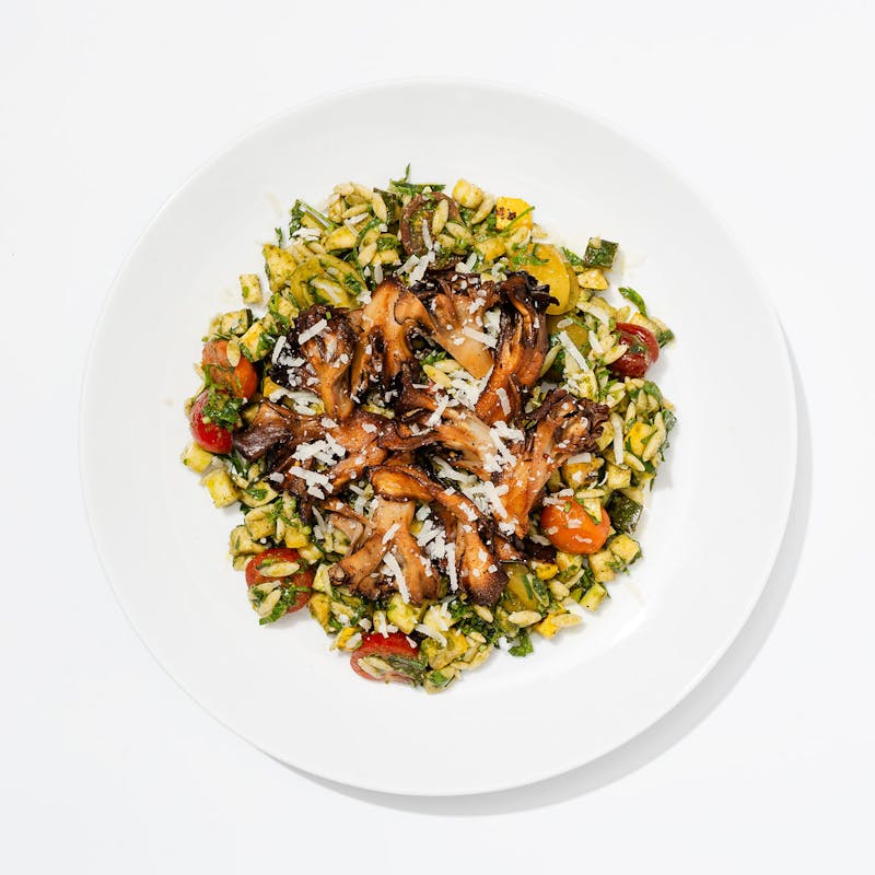 Maitake Mushroom, Pecorino Cheese, Cherry Tomato, Canola and Olive Oil Blend, Extra Virgin Olive Oil, Black Pepper, Lemon, Garlic, Dijon Mustard, Fennel Seed, Lemon Zest, Zucchini, Orzo, Kosher Salt, Shallot, Apple Cider Vinegar, Black Truffle Oil, Lemon Juice, Basil, Fennel, Italian Parsley, Maple Syrup