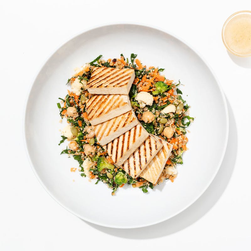 Loaded with feel-good grains and greens, this powerhouse bowl packs both flavour and function. Grilled tofu is layered over a mix of quinoa and lentils, with nourishing vegetables like broccoli, cauliflower, and carrots. Sunflower and pumpkin seeds add crunch, while currants bring a subtly sweet chew. A drizzle of maple-cider vinaigrette adds a lively, tangy contrast.