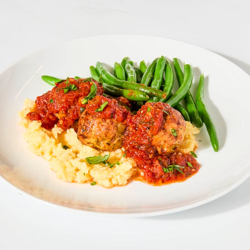 Juicy turkey meatballs simmer in flavorful tomato sauce and land on a bed of creamy, velvety polenta. Lightly seasoned green beans on the side keep things fresh and bright in this wholesome, comforting meal.