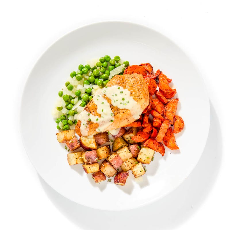 Here’s comfort with a French accent. Juicy chicken breast—slow-roasted with garlic and parsley—rests on a bed of buttered peas and onions, with roasted potatoes and honey-glazed carrots tucked nearby. A white wine cream sauce ties it all together in one smooth, savory spoonful.