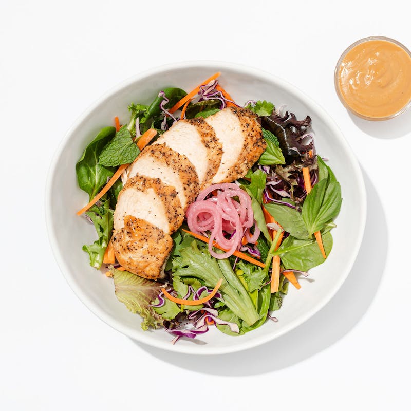 Cashew Butter, Canola and Olive Oil Blend, Napa Cabbage, Carrots, Red Onion, Mint, Toasted Sesame Oil, Black Pepper, Cilantro, Garlic, Honey, Sugar, Light Soy Sauce, Kosher Salt, Little Gem Lettuce, White Vinegar, Black Pepper, Lime Juice, Rice Wine Vinegar, Green Onion, Ginger, Crushed Red Pepper, Basil, Chicken Breast, Red Cabbage