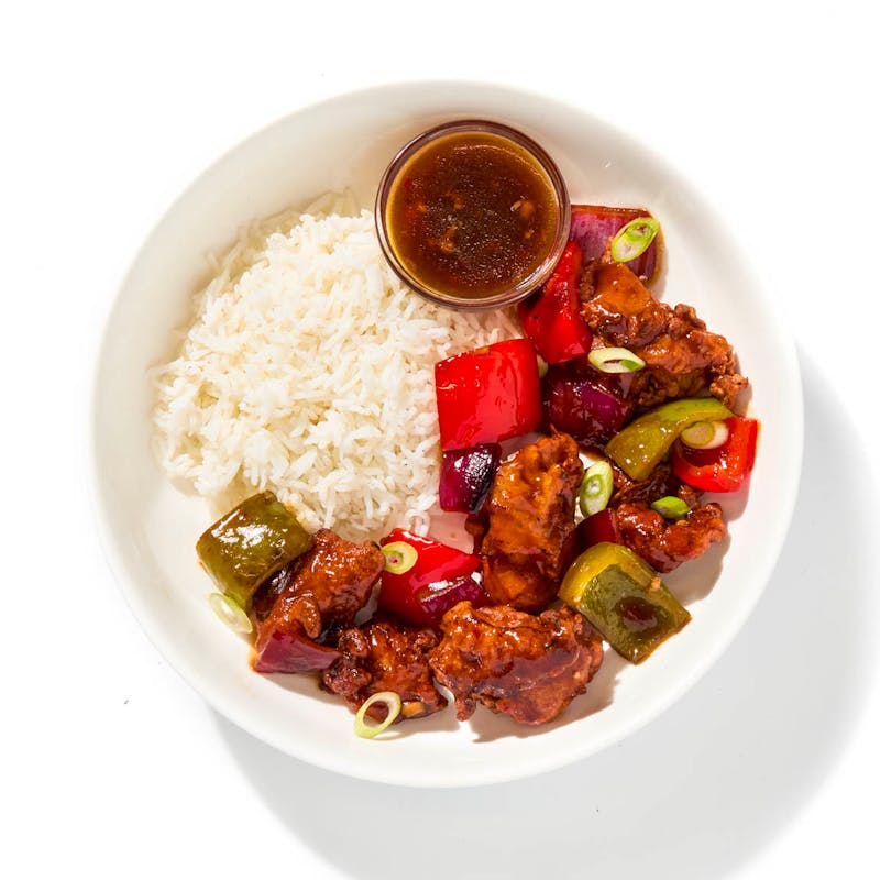 Bold, spicy, and rooted in Hakka culinary tradition, this dish delivers punchy flavour with every bite. Chicken thighs are marinated in a glossy blend of soy, vinegar, and sweet chili, laced with fresh ginger and garlic, then fried until golden and crisp. They're tossed with a stir-fried mix of red and green bell peppers, red onion, Thai green chilies, and scallions, then served over soft white rice.