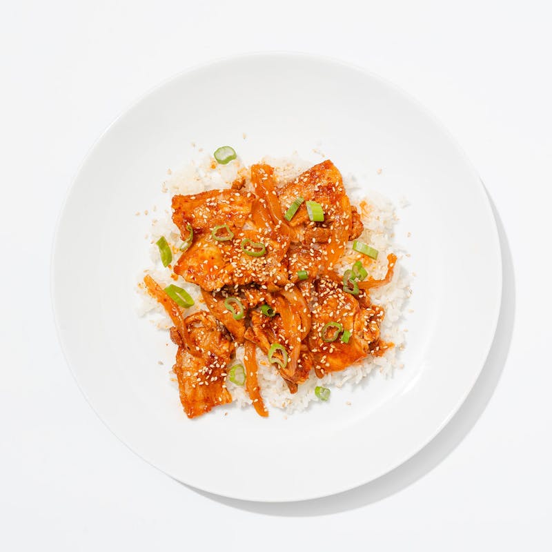 Thin slices of pork belly are wok-seared, then tossed with slivers of onion and a garlicky gochujang sauce, laced with soy, mirin, and a touch of fish sauce for umami depth. Finished with a drizzle of toasted sesame oil and a sprinkle of white sesame seeds, it’s served with a soft bundle of rice.