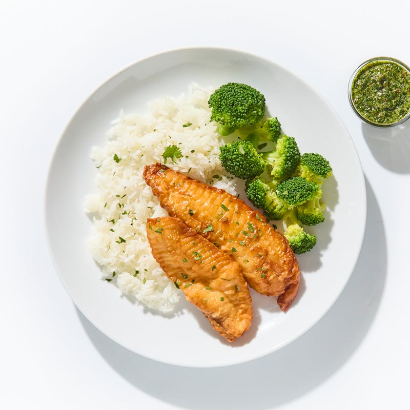 Enjoy golden tilapia fillets served atop a bed of fragrant jasmine rice and with vibrant broccoli. Chef Sand's signature Thai dipping sauce—made with fish sauce, garlic, green apple, and chiles—brings the sweet, tangy, and spicy flavors of Thailand to your table.