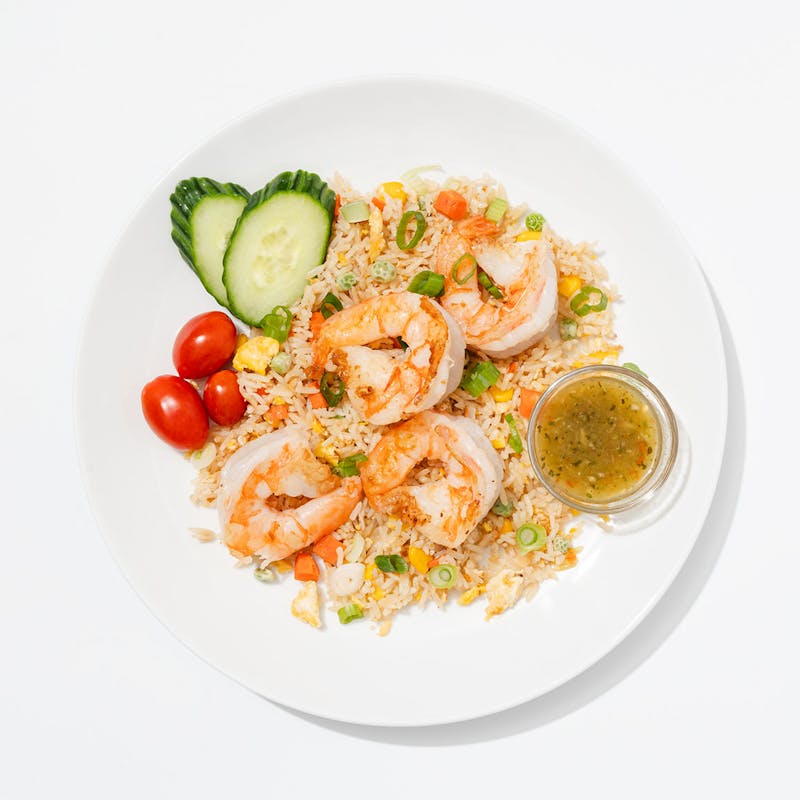 *NOTE: Nutritional Values are calculated assuming full consumption of all included condiments or dressings, which may make up a significant percentage of the values below. Jasmine rice is stir-fried with garlic and egg, then tossed with a savoury blend of soy, fish sauce, and seasoning, along with carrots and peas for texture and sweetness. Plump sautéed shrimp are nestled on top, finished with fresh cilantro and green onion. On the side, crisp cucumber and juicy cherry tomatoes add a refreshing bite, while Thai Nam Jim sauce brings sharp chili heat and citrusy brightness to round it all out.