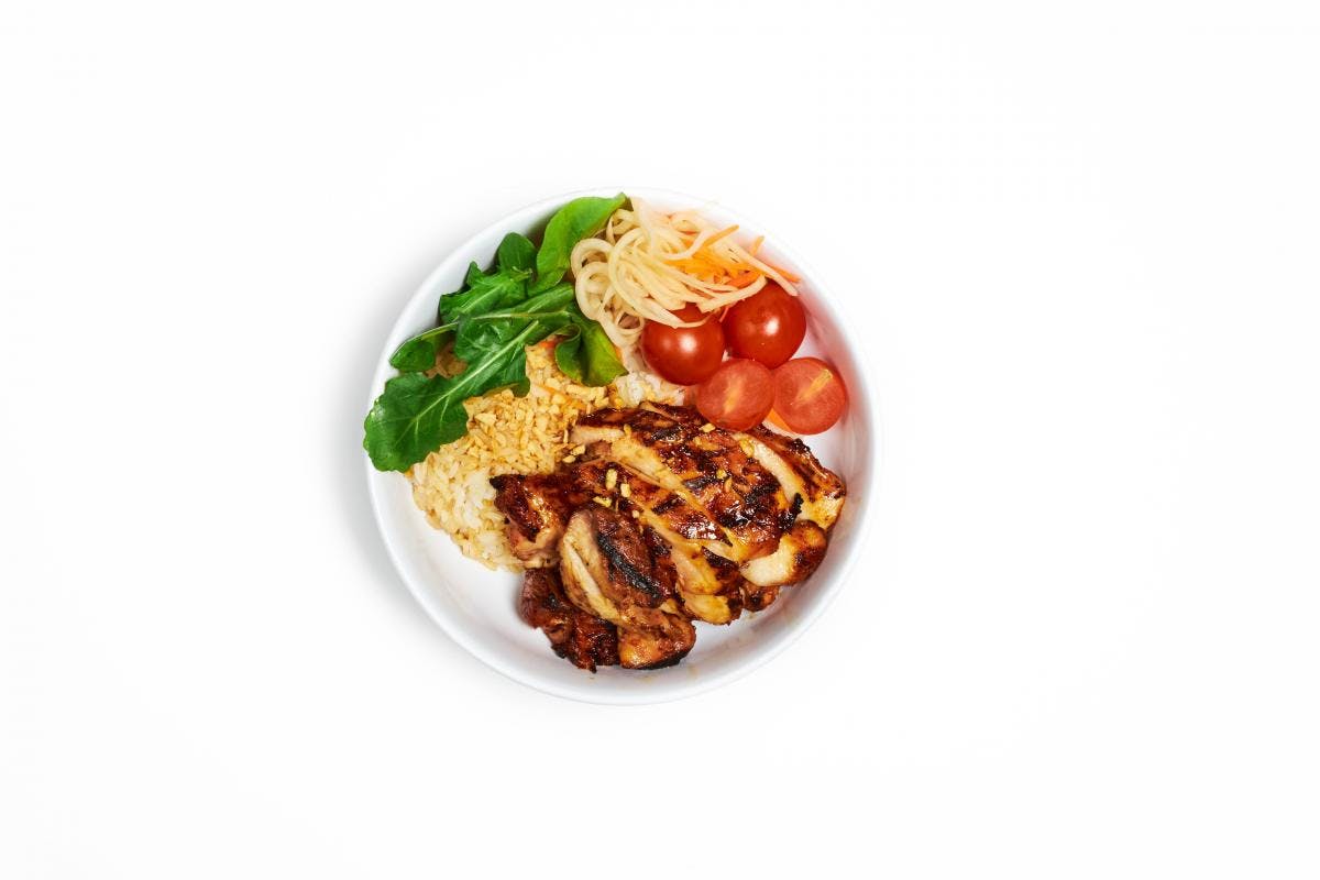 Place a portion of the steamed garlic rice. Add the grilled chicken thighs on top of the rice. Place a serving of pickled atchara on the side. Garnish with blistered cherry tomatoes and baby arugula. Sprinkle with fried garlic for an extra crunch.