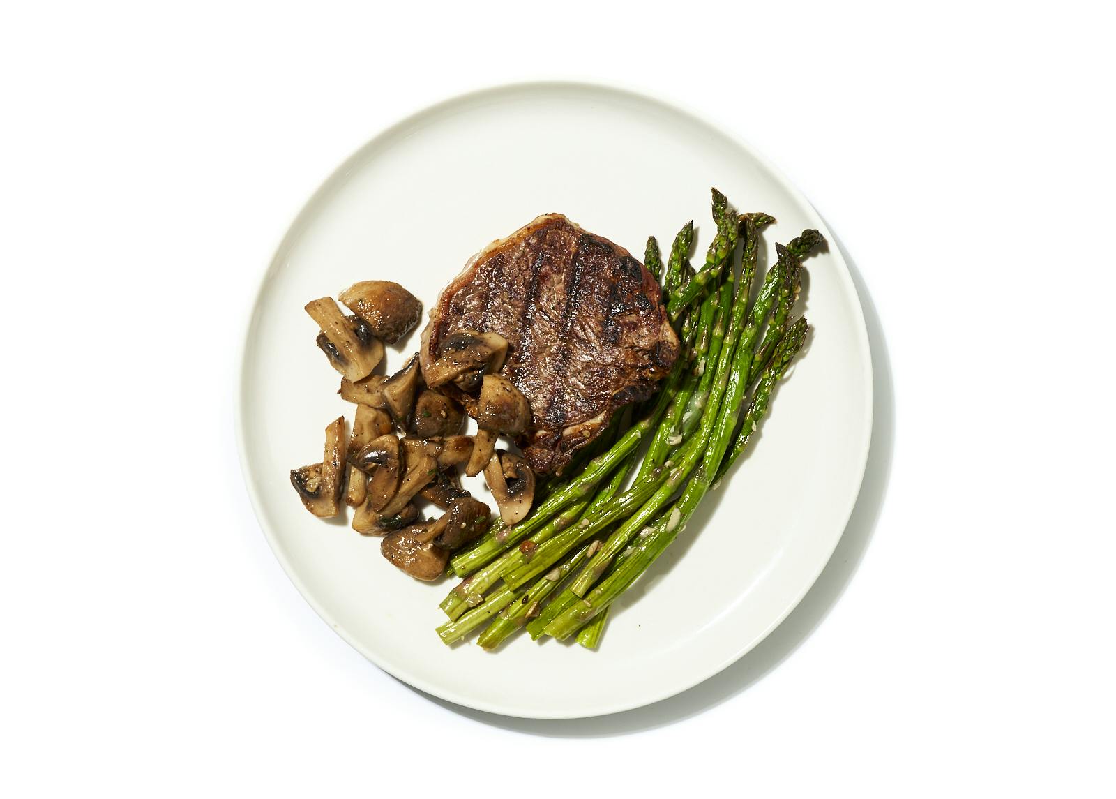 It doesn't get better than Chef Dustin's perfectly grilled ribeye steak, especially once it's topped with homemade garlic butter. The exquisite steak could stand out all on its own, but a side of tender roasted asparagus and garlicky sautéed mushrooms certainly don't hurt.