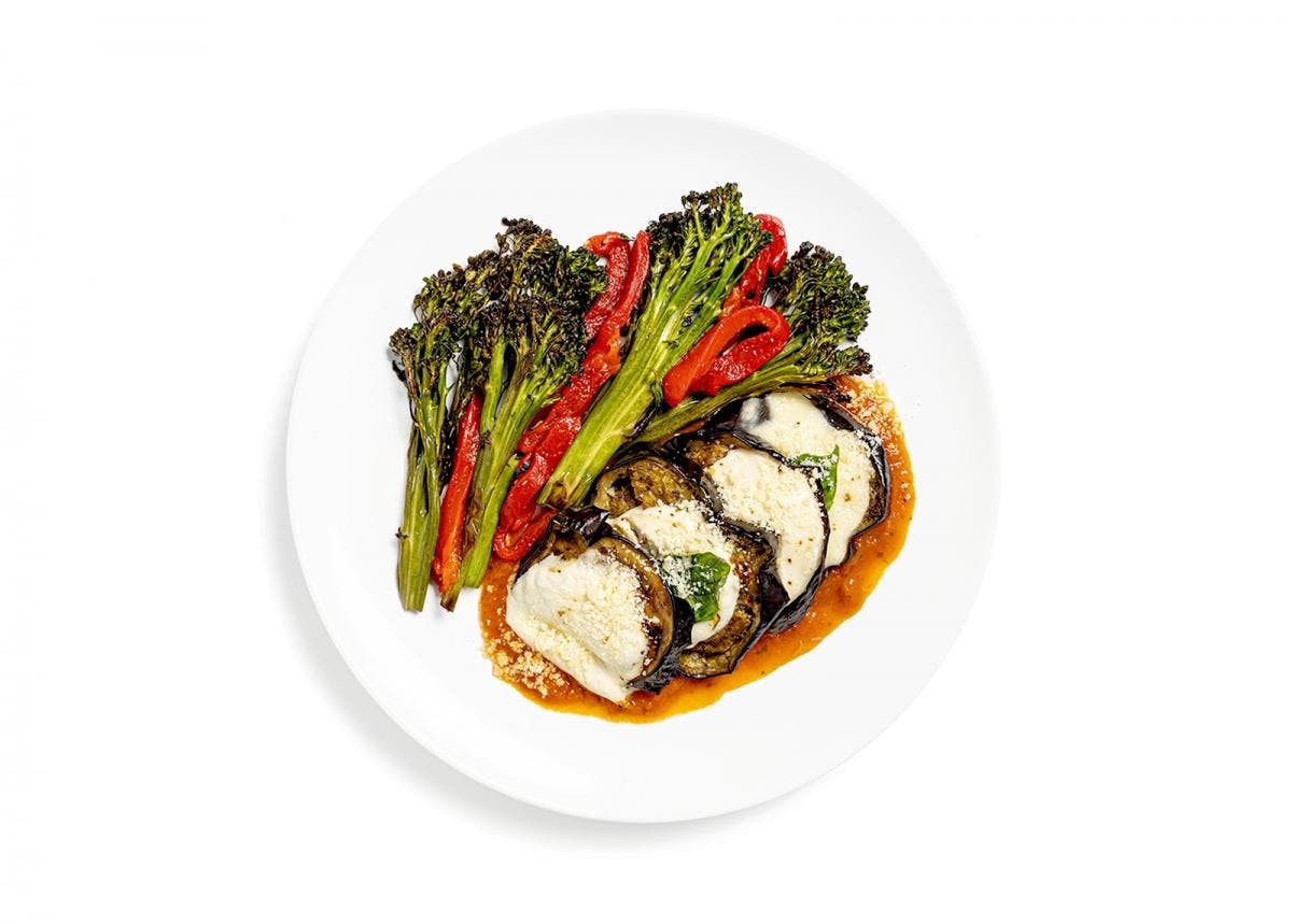 Chef Chris wanted to come up with a healthier alternative to the deep-fried eggplant you typically see on Italian menus, but without sacrificing any of the flavor. He decided on simply roasted thin slices of seasoned eggplant, layered Napoleon-style with hand-sliced fresh mozzarella, and served with fresh roasted tomato sauce. Garlicky broccolini and roasted peppers round out this filling and delicious meal, which also turned out to be low-carb and gluten-free in the process!
