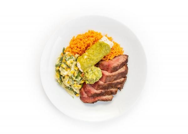 In a bowl, mix 0.055 oz dried guajillo chile, 0.005 oz achiote paste, 0.002 oz apple cider vinegar, 0.073 oz water, 0.018 oz fresh orange juice, 0.007 oz lime juice, 0.009 oz yellow onion, 0.002 oz garlic, 0.164 oz canola oil, and 0.001 oz kosher salt. Marinate 5.263 oz flank steak in this mixture for at least 30 minutes. Grill the steak until desired doneness is reached. Let it rest before slicing.